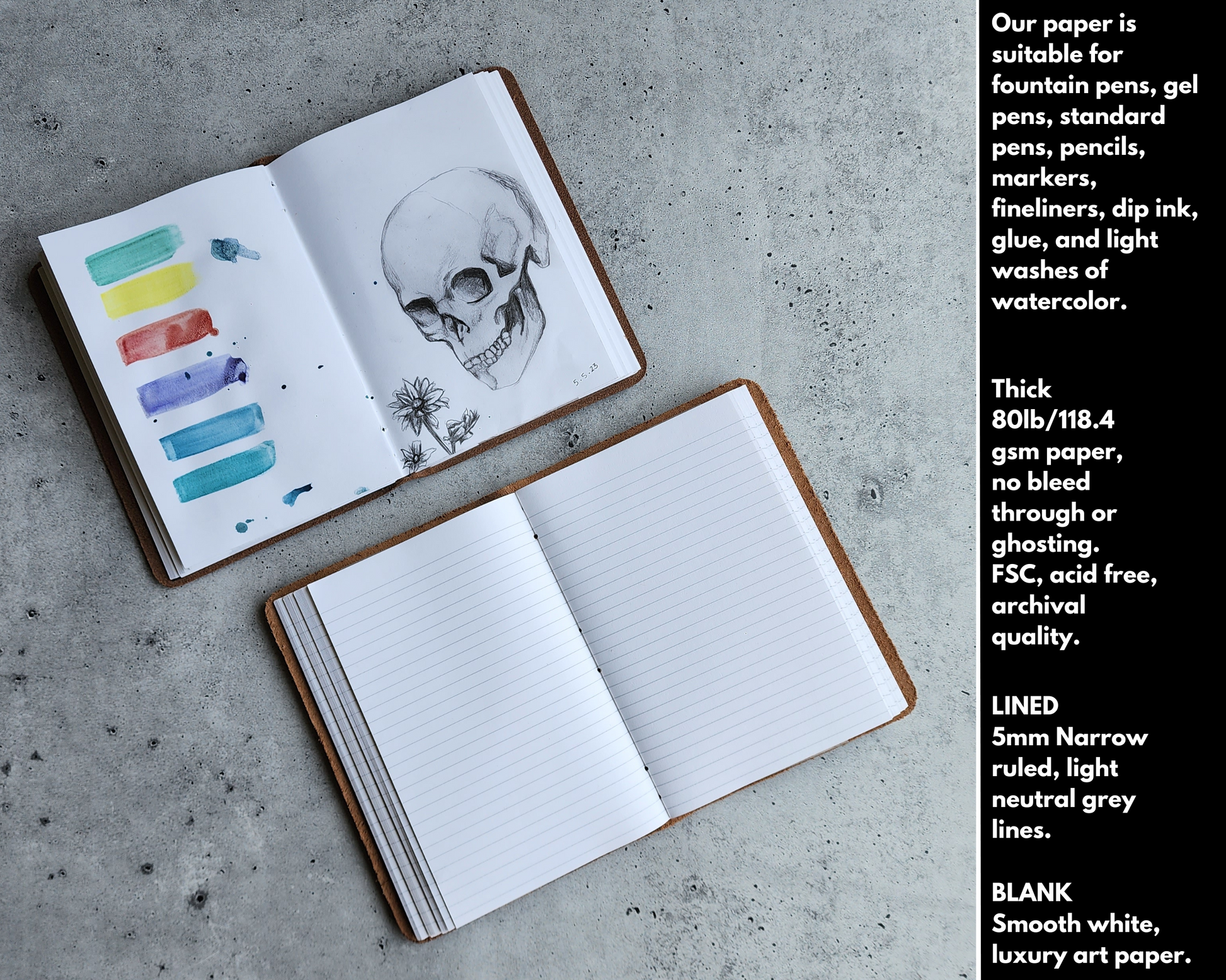 I purchased the notebook with elastic closure for my nephew. The paper used in the refills is excellent quality. The leather notebook is perfect and will last forever. I am happy I found your Instagram account. I am now considering ordering one for myself.